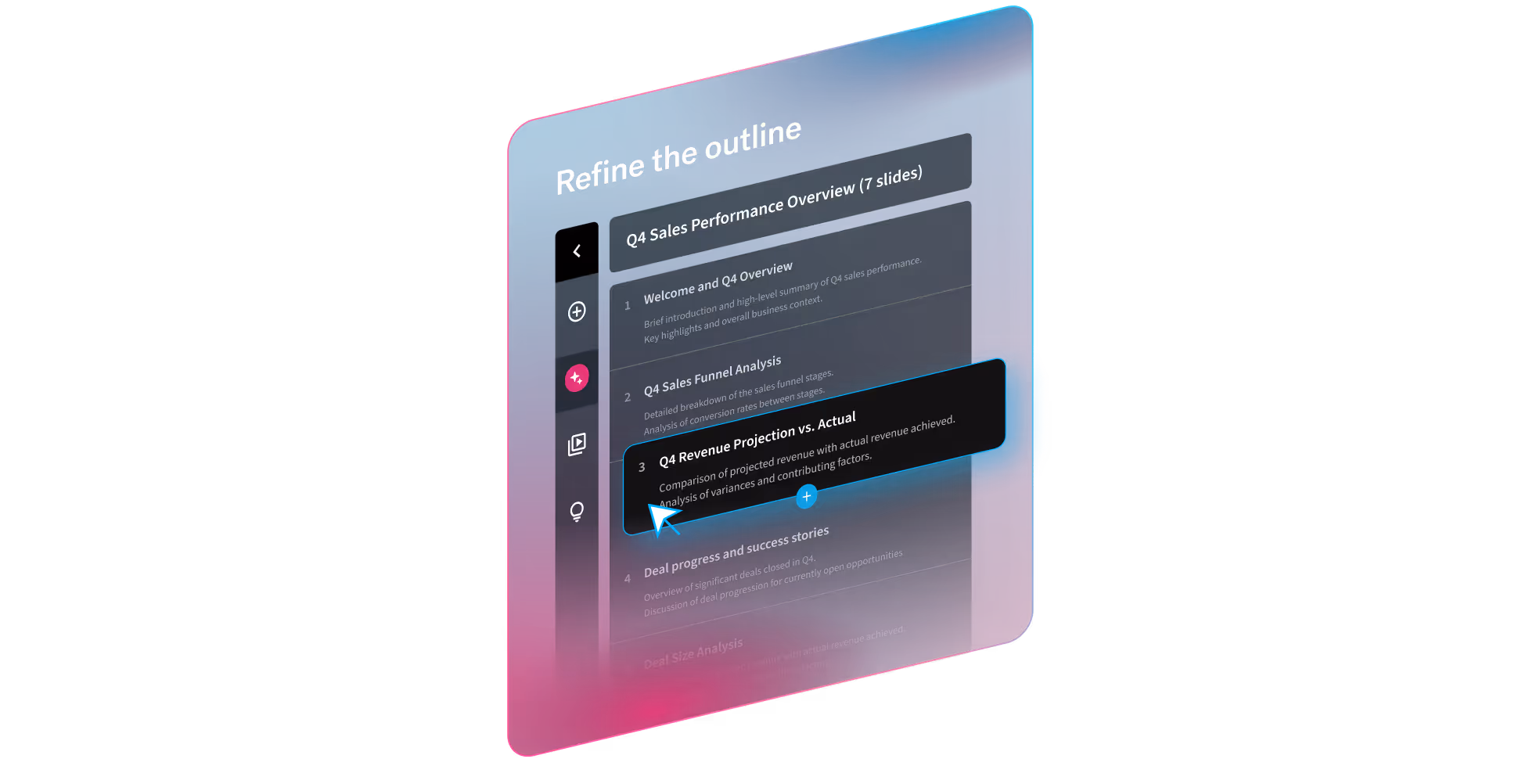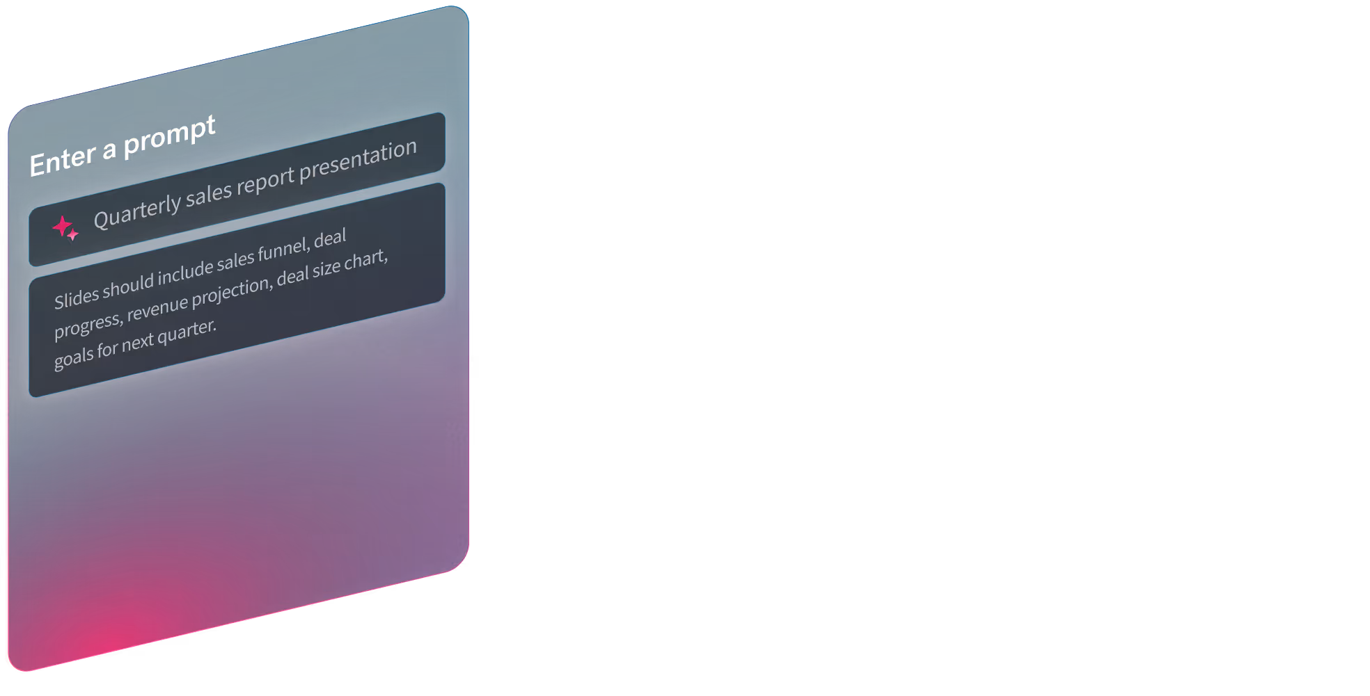 Discover AI that creates what you asked for. Our new AI presentation workflow is smarter, faster, and more flexible. Get to work-ready slides, 10x faster.