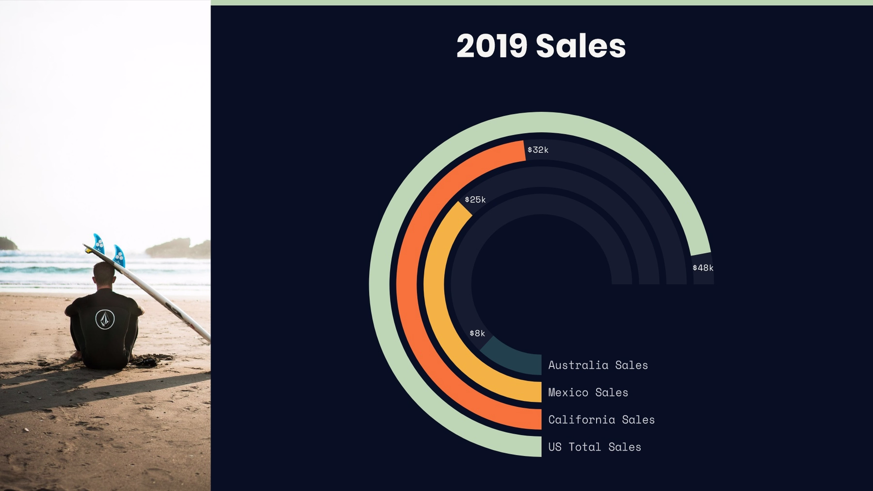 For a visually interesting twist on a plain bar chart, add a radial bar chart slide to your presentation. Our data comparison template is similar to a bar graph, using bars of varying lengths to display measured data. The data comparison template, however, displays percentages instead of exact numbers. One of the best things about using our data comparison slide? You can customize it for your presentation. Create a horizontal or vertical slide, remove or add grid lines, play with its design, and more.