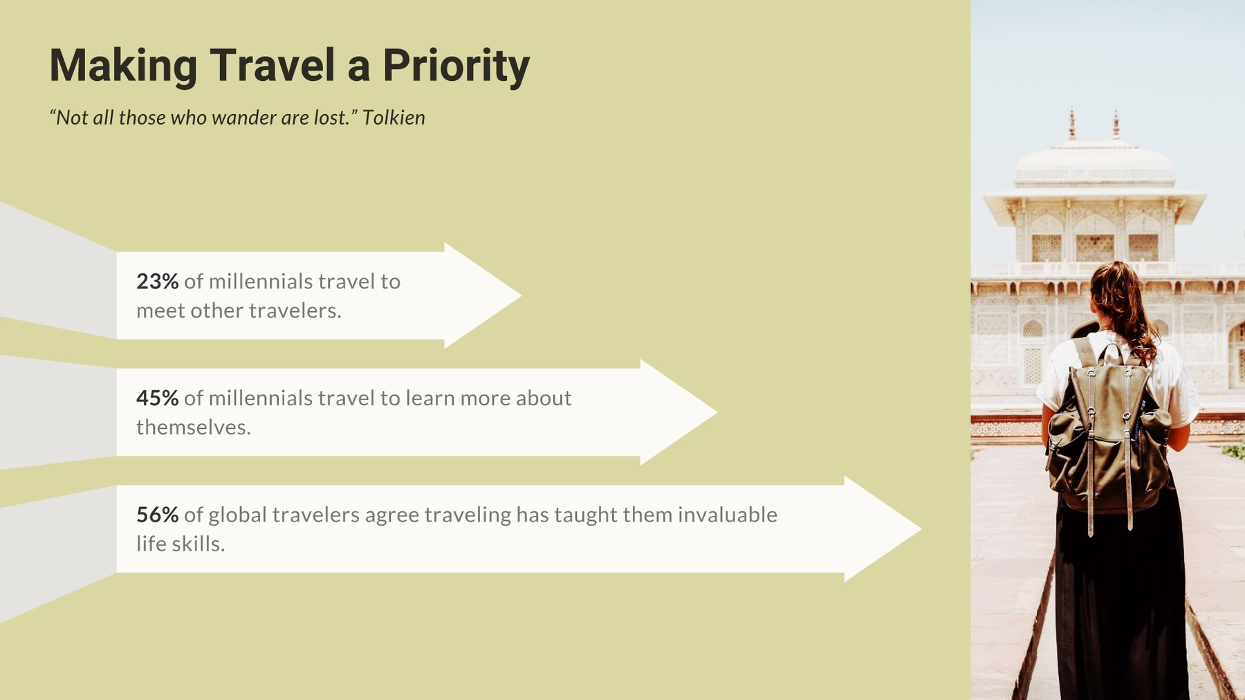 Need to dress up a plain list of data? An infographic presentation slide displays your data in an interesting, impactful way. Instead of adding a regular bullet list to a slide, an infographic slide uses arrow bars to organize your data. Arrow bars can imply relationships or movement between data points, explain steps to achieve a goal, or make any list in your presentation look well-designed.