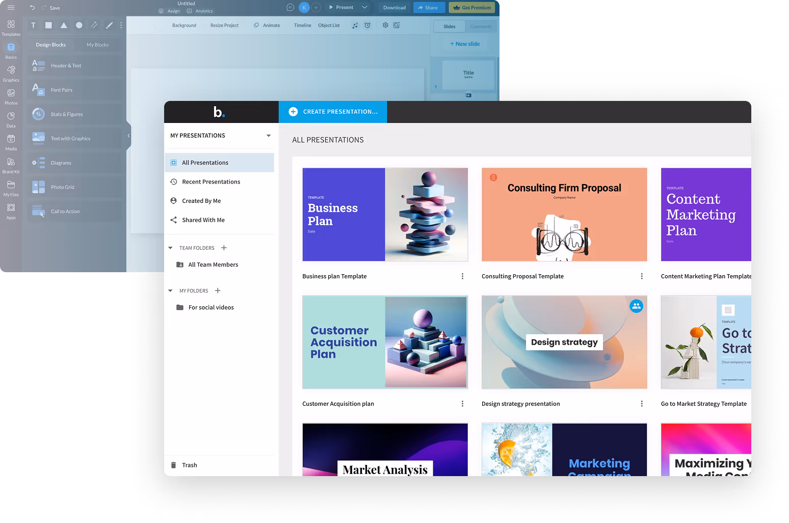 Sometimes you can have too much of a good thing. While Visme is a one-stop shop for creating different types of visual content, including slide decks, their variety of design options can be overwhelming for users who aren’t experienced designers. Plus, there are a number of limitations on their free plan, including the number of projects, slide templates, download formats, and more.